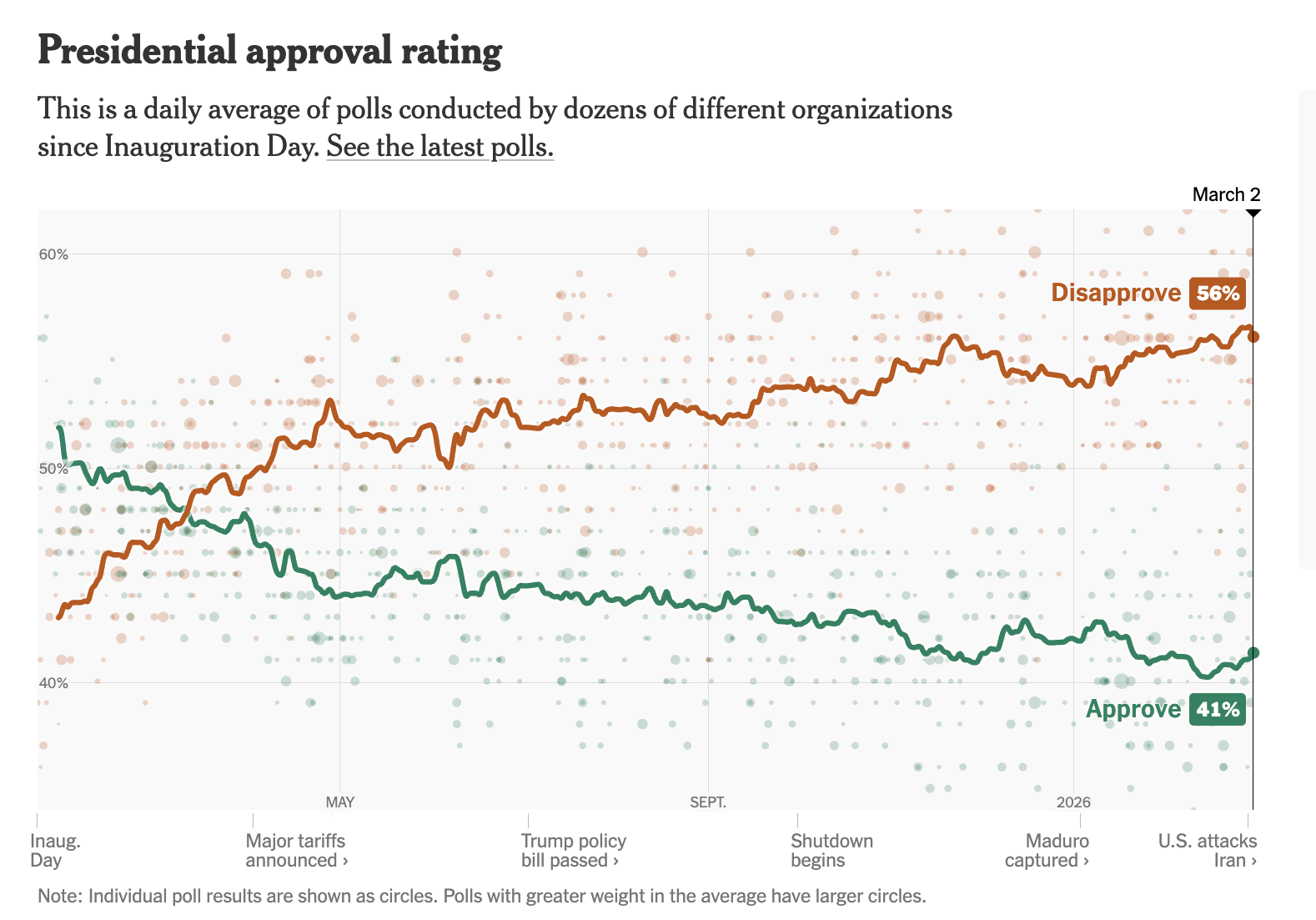 Other polls had better — but still bad — numbers for Trump. A Washington Post poll put support at only 39%, and a CNN poll found 41% approved with 59% disapproving. I’ve seen some internal Democratic polling showing public opinion a little more closely divided, but that’s mostly because there’s a larger pool of undecideds. Approval is still in the low 40s.