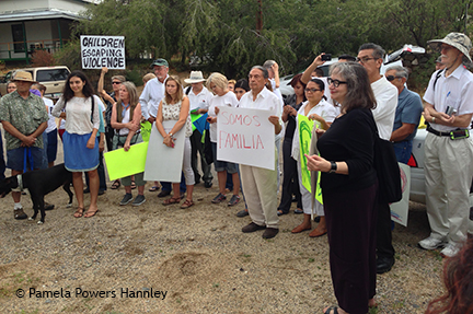 The original anti-immigrant protest was organized by Oracle’s self-proclaimed “Paul Revere” Robert Skiba, who was tipped off regarding the busload of refugee children by Pinal County’s Tea Party Sheriff Paul Babeu. Babeu’s grandstanding on Facebook about the federal government’s failed immigration policies, and Skiba’s boasting about a bus blockade to multiple media outlets sparked a counter protest initiated by Oracle residents who were concerned about the welfare of the children. E-mail blasts, Facebook, Twitter, blog posts like this one, and a re-Tweet by Rachel Maddow’s blog brought out the crowds, including sympathizers on both sides who drove in from Tucson and Phoenix.
