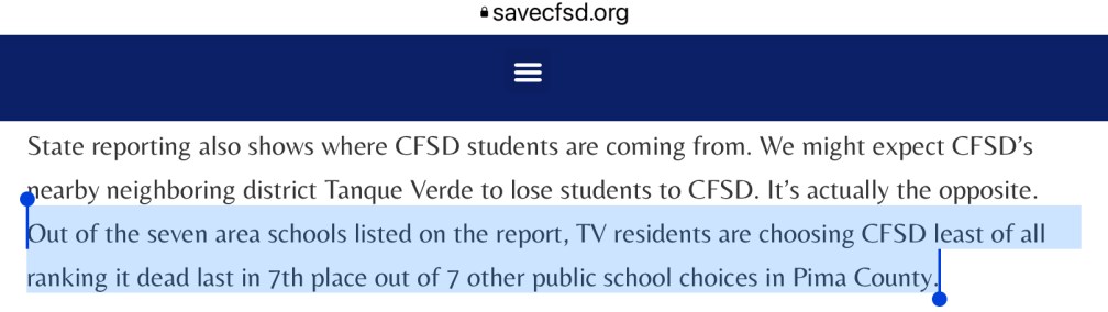 Out of the seven area schools listed on the report, TV residents are choosing CFSD least of all ranking it dead last in 7th place out of 7 other public school choices in Pima County, says SaveCFSD.