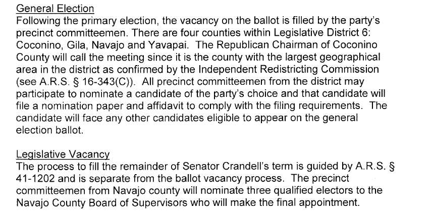 From a letter to elections officials in Coconino, Gila, Navajo, and Yavapai counties (parts of each fall within Legislative District 6) from the AZSOS regarding the filling of Crandell’s seat and his spot on the ballot: