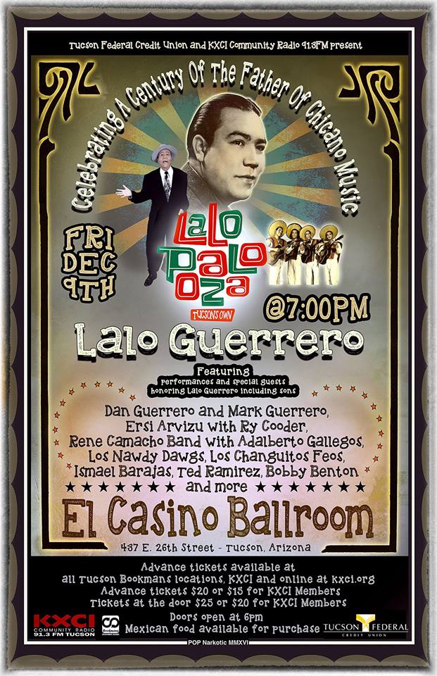 “Tucson Federal Credit Union and KXCI present Lalopalooza on Friday, December 9th at El Casino Ballroom as we celebrate the upcoming 100th Anniversary of legendary Tucson Born Musician Lalo Guerrero who was born on December 24th, 1916. With Lalopalooza, we celebrate the joyous life and work of the father of Chicano Music – Lalo Guerrero – a prolific composer, musician, comic and inspiration to all. We also celebrate KXCI Community Radio’s 33rd Anniversary (having gone on the air on December 6, 1983.)”