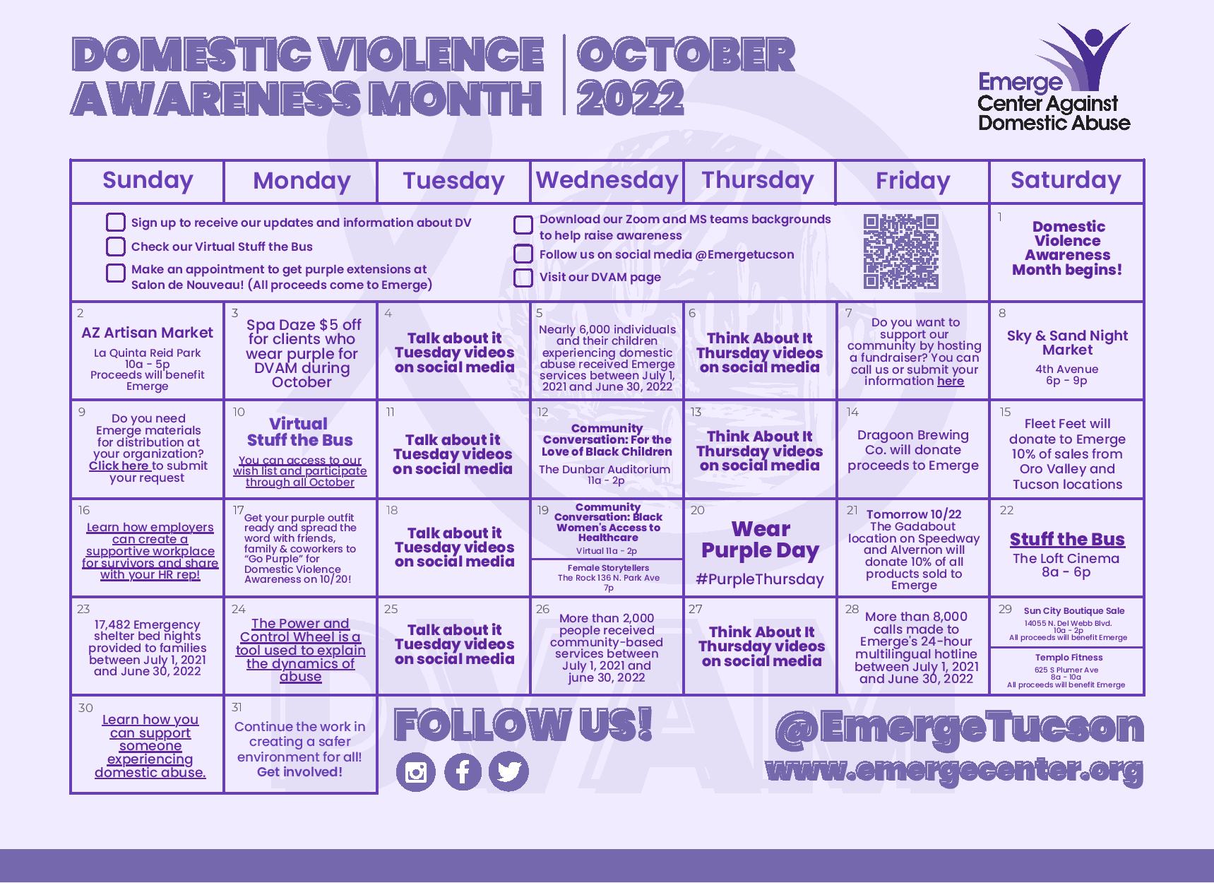 More info at:https://emergecenter.org/events-and-news/domestic-violence-awareness-month/ “Every October, Emerge partners with the community during our month-long educational campaign, Domestic Violence Awareness Month. During this month we develop and share an educational email campaign, celebrate survivors on Wear Purple Day, host community events and coordinate with community fundraisers. There are many ways to get involved! Wear Purple Day: On Thursday, … Read more