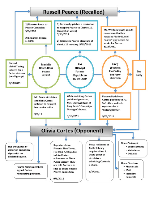 I can't take credit for putting this together (but wish I could! 🙂 ), but here is a great graphical summary of some of the ties between recalled state senator Russell Pearce and his supporters and the "campaign" of Olivia Cortes, one of the other two candidates on the ballot in November's recall election (the other being Jerry Lewis).