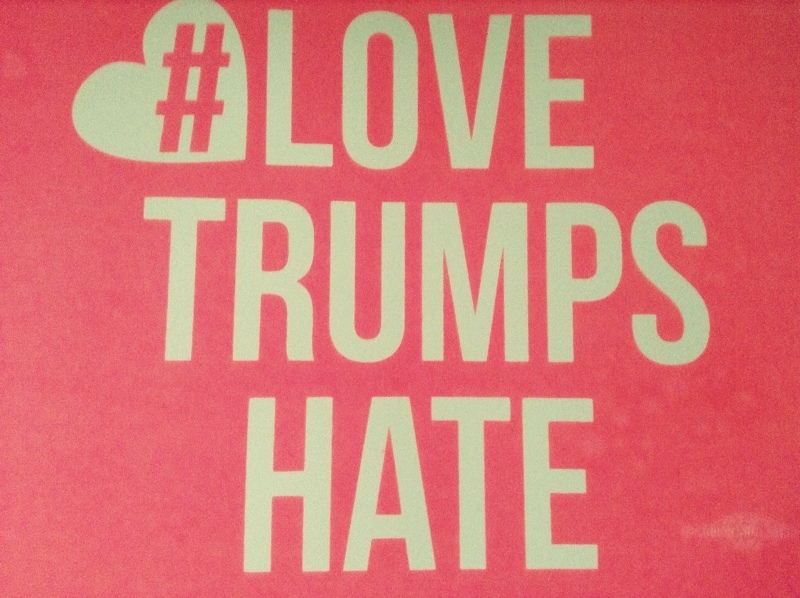 Many signs said #LOVE TRUMPS HATE in bright pink (see below). We saw CD 3 Congressman Raul Grijalva and later District 5 Supervisor Richard Elias march by, as did many, many Tucson activist friends. Later we heard Ward 1 Councilwoman Regina Romero speak at the Tucson Solidarity Rally, ending with “Si se puede”.